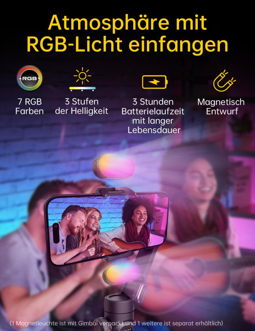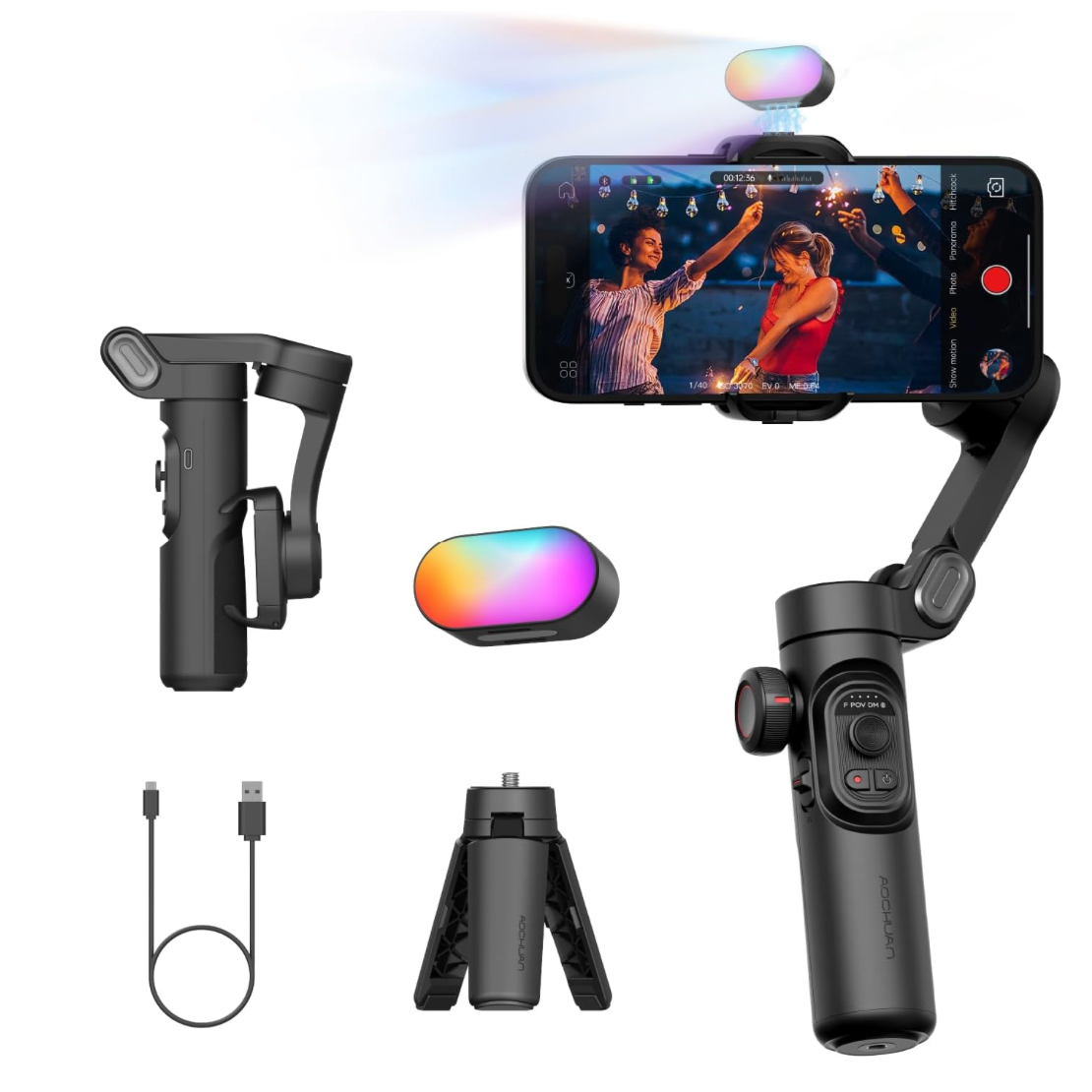AOCHUAN 3-Achsen-Gimbal-Stabilisator für Smartphone, Gimbal mit magnetischem RGB-Fülllicht, verbesserte Gesichtsverfolgung, Fokusrad, Faltbarer iPhone-Gimbal für iPhone/Android-Aufnahmen-Smart XE Kit