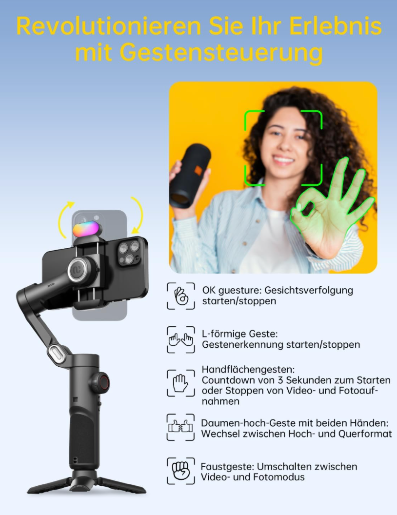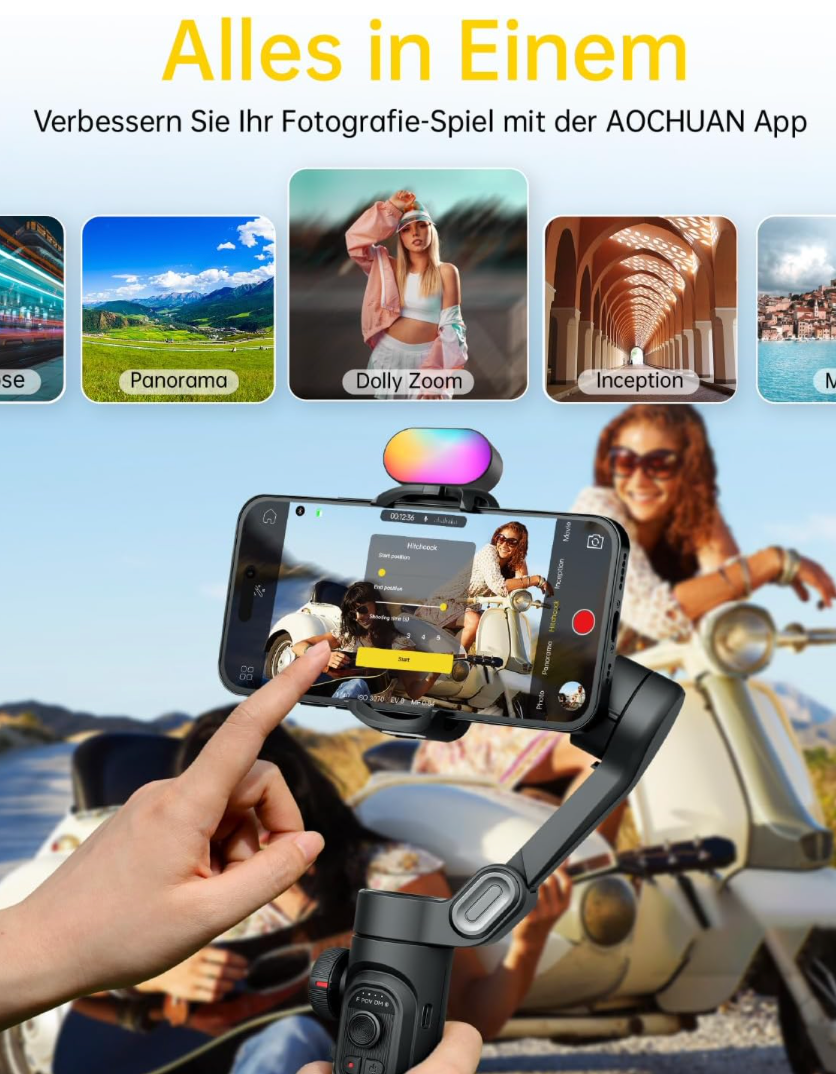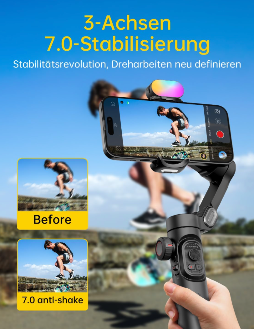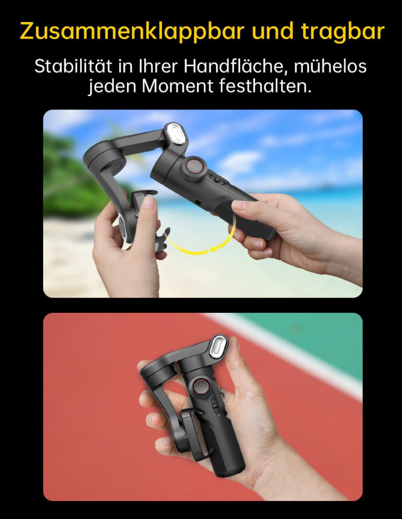 - [Leistungsstarke und vielseitige 3-Achsen-Faltbarer Universal-Stabilisator für Smartphones. Ein leistungsfähiger Universalgelenk-Stabilisator als jedes andere Smartphone ist kompatibel mit iPhones und den meisten Android-Handys. Multifunktionale Kompatibilität: Geeignet für Videoaufnahmen, Live-Übertragungen, Selfies, Wandern und Sport-Szenen. Ein-Klick-Video-Taste mühelos zwischen den horizontalen und vertikalen Modus wechseln, um schnell ein Video oder einen YouTube-Kurzfilm zu drehen.