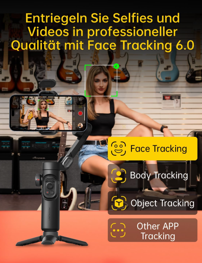 - [AI Face Track 4.0] Virtuelle Steuerung in unserer intuitiven Okawa App: Verwenden Sie problemlos jede Art von Aufnahmemodus, einschließlich Panorama, Weitwinkel, Film- und Filmmodus, Live-Streaming, Verzögerung und Bewegungsverzögerung, und optimieren Sie die nativen Kameraeinstellungen Ihres Telefons. Tutorial-Videos in unserer integrierten Okugawa-App und YouTube-Kanal zur Verfügung gestellt.