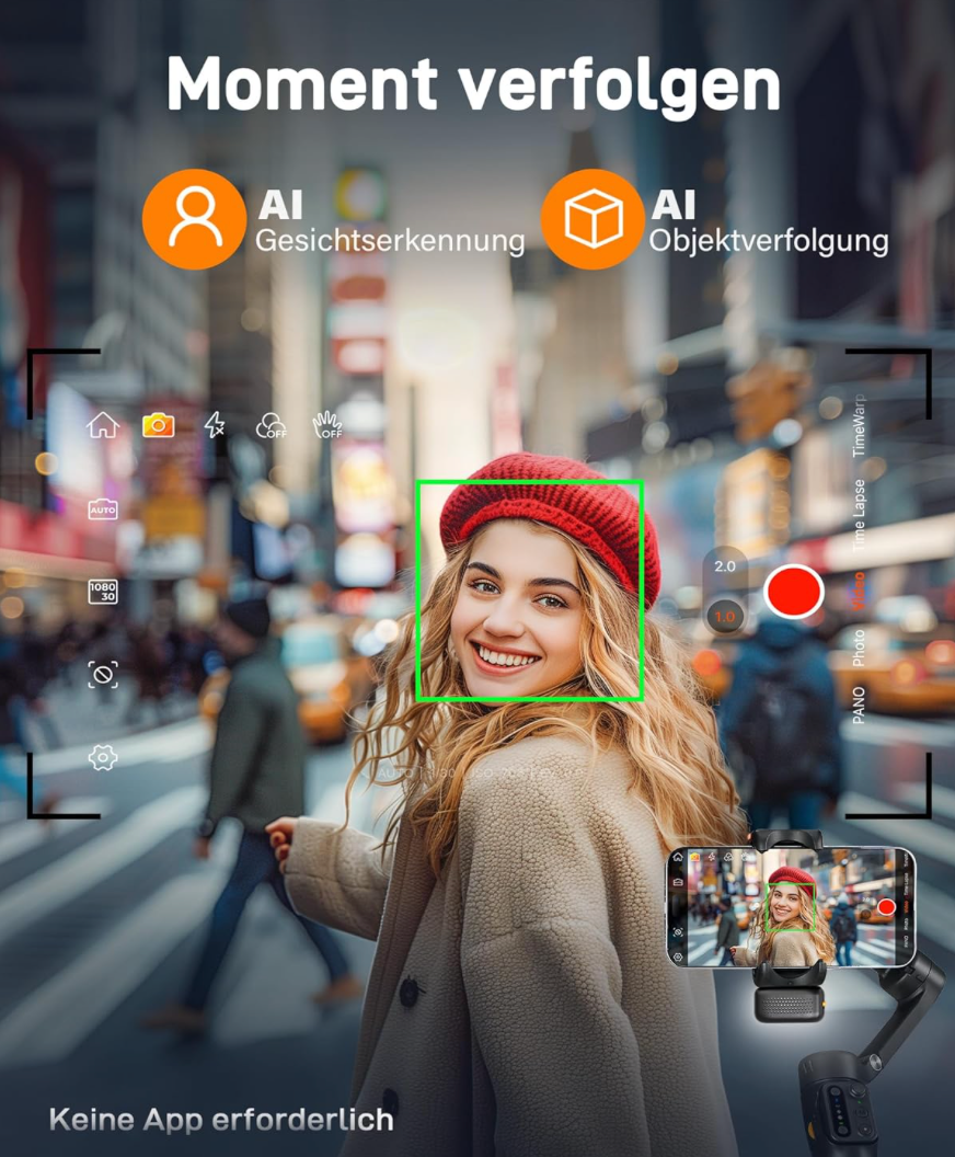 - Magnetischer KI-Tracker - Genießen Sie uneingeschränktes Filmen mit einem magnetischen KI-Tracker, der ohne App-Beschränkungen funktioniert und Ihre dynamischen Reise-Vlogs und Outdoor-Abenteuer verbessert