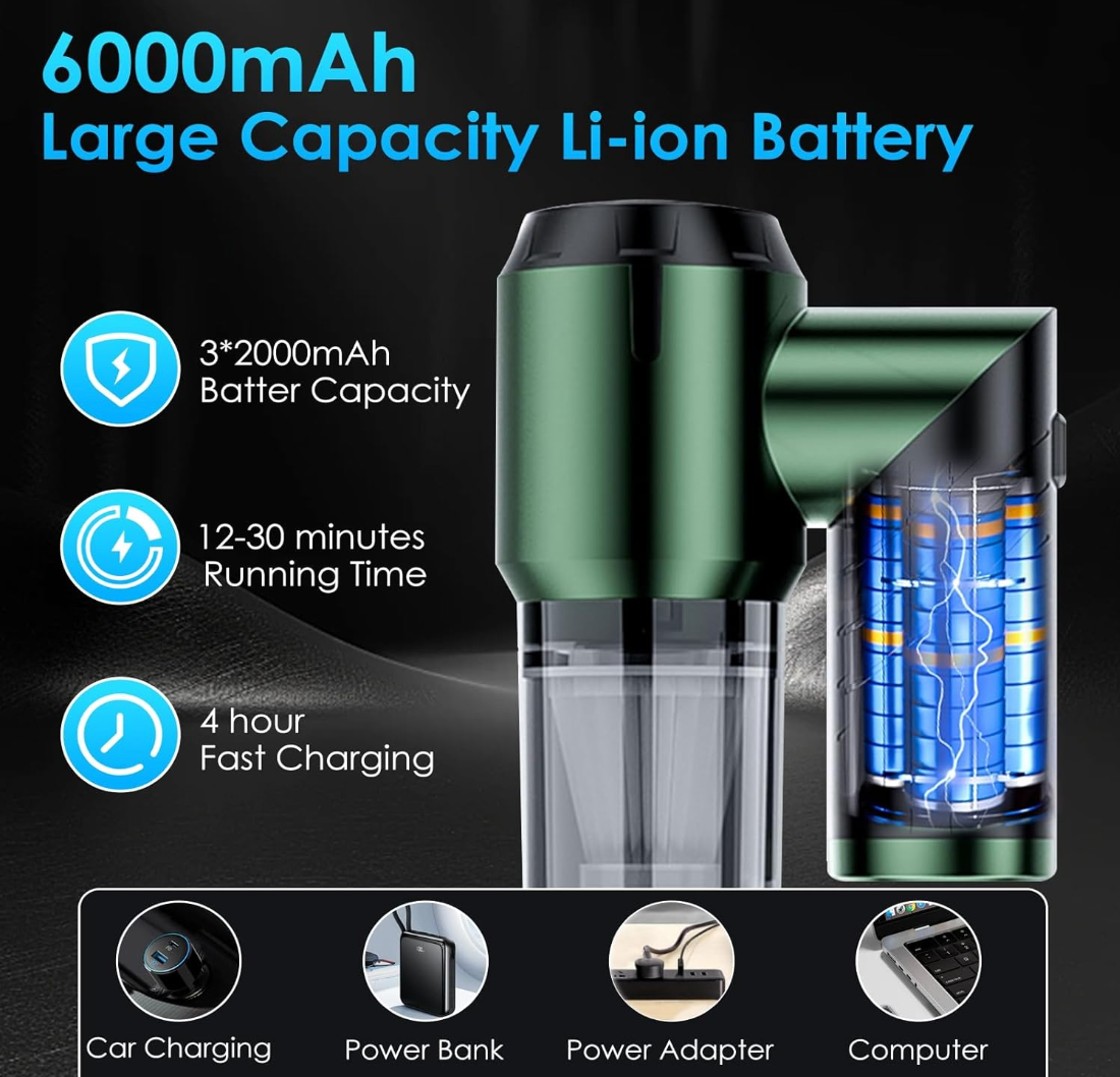 - 【6000mAh Akku mit großer Kapazität】Dieser Handstaubsauger verwendet 3 2000mAh Lithium-Ionen-Akkus und Schnellladetechnologie. Das vollständige Aufladen dauert 4 Stunden und die Akkulaufzeit beträgt 12 bis 30 Minuten (die Laufzeit variiert je nach Saugleistung). Im Lieferumfang ist ein USB-C-Ladekabel enthalten, mit dem Sie in verschiedenen Szenarien aufladen können: Computer, Steckerladung, Autoladegerät, Powerbank