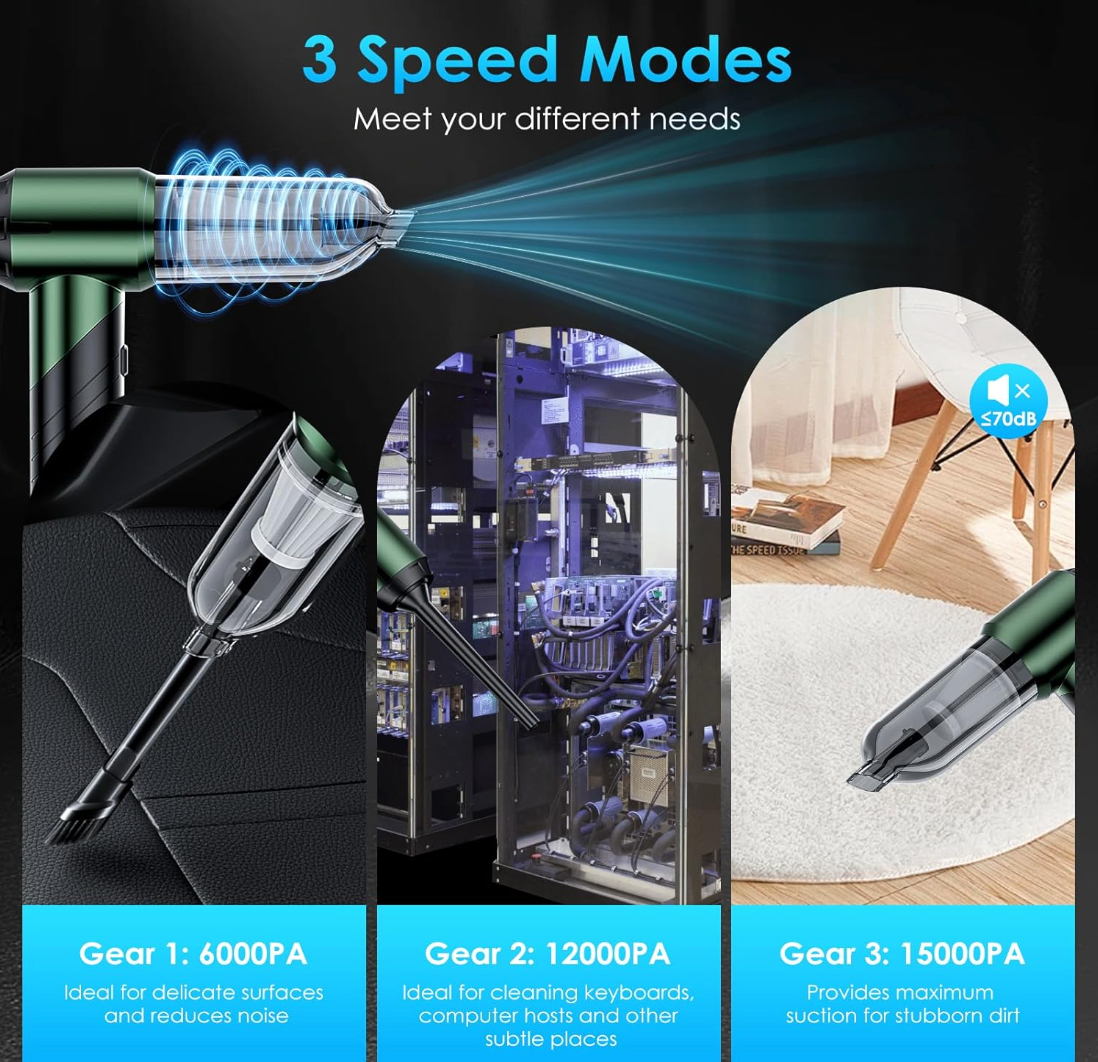 - 【15000Pa Starker Motor】Der Autostaubsauger ist mit einem 15000Pa/100W starken Motor ausgestattet, der eine Reinigungsleistung von 99,9 % hat und damit stärker ist als die meisten Staubsauger. 3 Saugleistungen erfüllen Ihre unterschiedlichen Bedürfnisse: 6000Pa/12000Pa/15000Pa, sodass Sie problemlos verschiedene kleine Ecken reinigen können