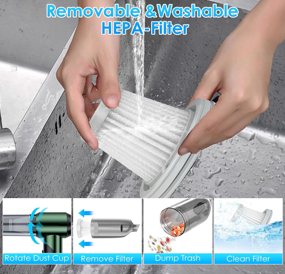 - 【Waschbarer HEPA-Filter】 Um ein besseres Reinigungserlebnis zu bieten, verwendet dieser Mini-Staubsauger einen hochdichten HEPA-Filter, der leistungsstärker und langlebiger als gewöhnliche Filter ist, sich leicht zerlegen und reinigen lässt, Feinstaub effektiv filtert und stark schmutzabweisend und langlebig ist. Ein zusätzlicher Filter ist im Produktpaket enthalten