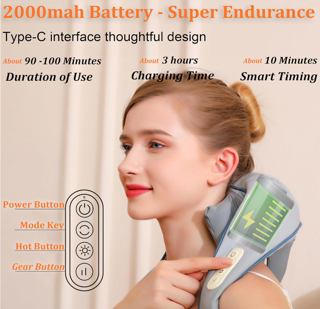- Entfesseln Sie die Kraft der Gelassenheit: Verabschieden Sie sich von Stress und Anspannung mit unserem batteriebetriebenen Massagegerät mit hoher Kapazität und 2000 mAh. Mit nur 4 Stunden Ladezeit bietet es beeindruckende 90–100 Minuten ununterbrochene Massage. Befreien Sie Ihre Hände und tauchen Sie überall in die Entspannung ein – zu Hause, im Büro oder auf Reisen. Laden Sie Körper und Geist auf und meistern Sie den Tag mit neuer Energie.