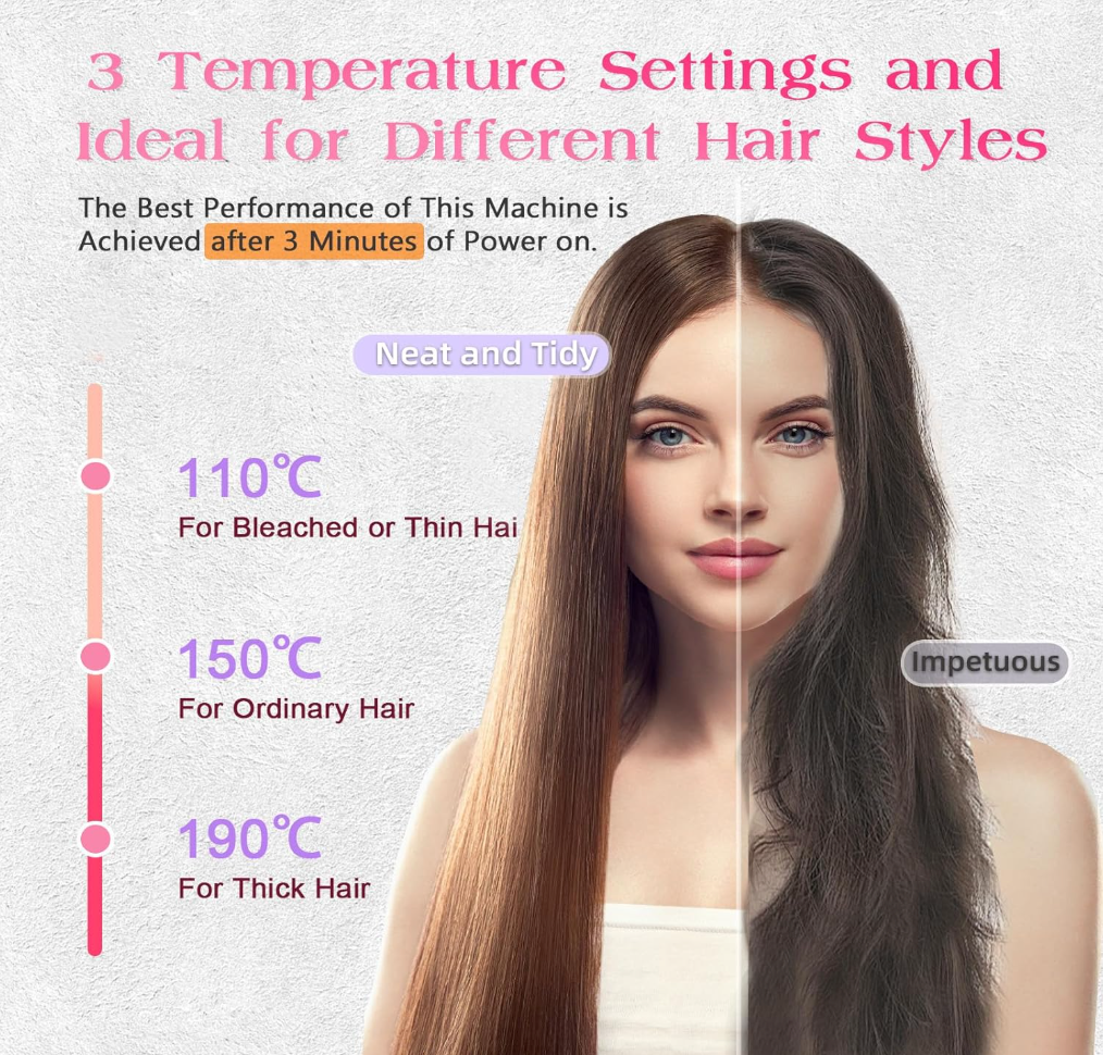 【3 Temperatureinstellungen】Die tragbare Glättbürste für Frauen bietet 3 Temperaturstufen von 110 °C über 150 °C bis 190 °C. Sie heizt sich in 3-5 Minuten auf die höchste Temperaturstufe von 190 °C auf. Wählen Sie die gewünschte Temperaturstufe. Die Kontrollleuchte blinkt, bis die rosaroten Zinken des Glättungskamms die gewünschte Temperatur erreicht haben. Wir empfehlen, 2–3 Minuten zu warten, bis die Temperatur ansteigt, damit das Glätten optimal wirkt.