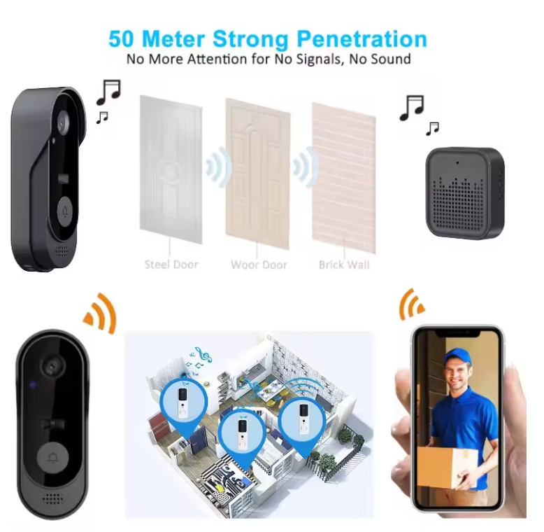 4. Lautstärkeeinstellung: Diese Türklingel hat ein starkes und stabiles Signal, einfaches Pairing und eine Übertragungsreichweite von bis zu 50 Metern. Die Lautstärke und der Klingelton können nach Ihren Wünschen eingestellt werden.