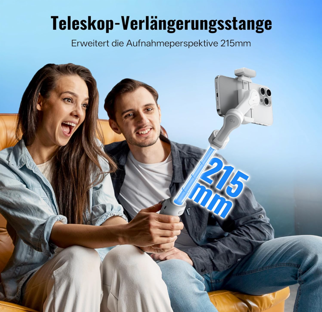 - [ Integrierte ausziehbare 215-mm-Stange ] Mit der eingebauten ausziehbaren 215-mm-Stange können Sie aus verschiedenen Winkeln einen breiteren und größeren Hintergrund aufnehmen. Erweitern Sie Ihre Kreativität auf Ihrem Abenteuer mit dem Smooth Q4 Smartphone Gimbal um eine neue Vision.