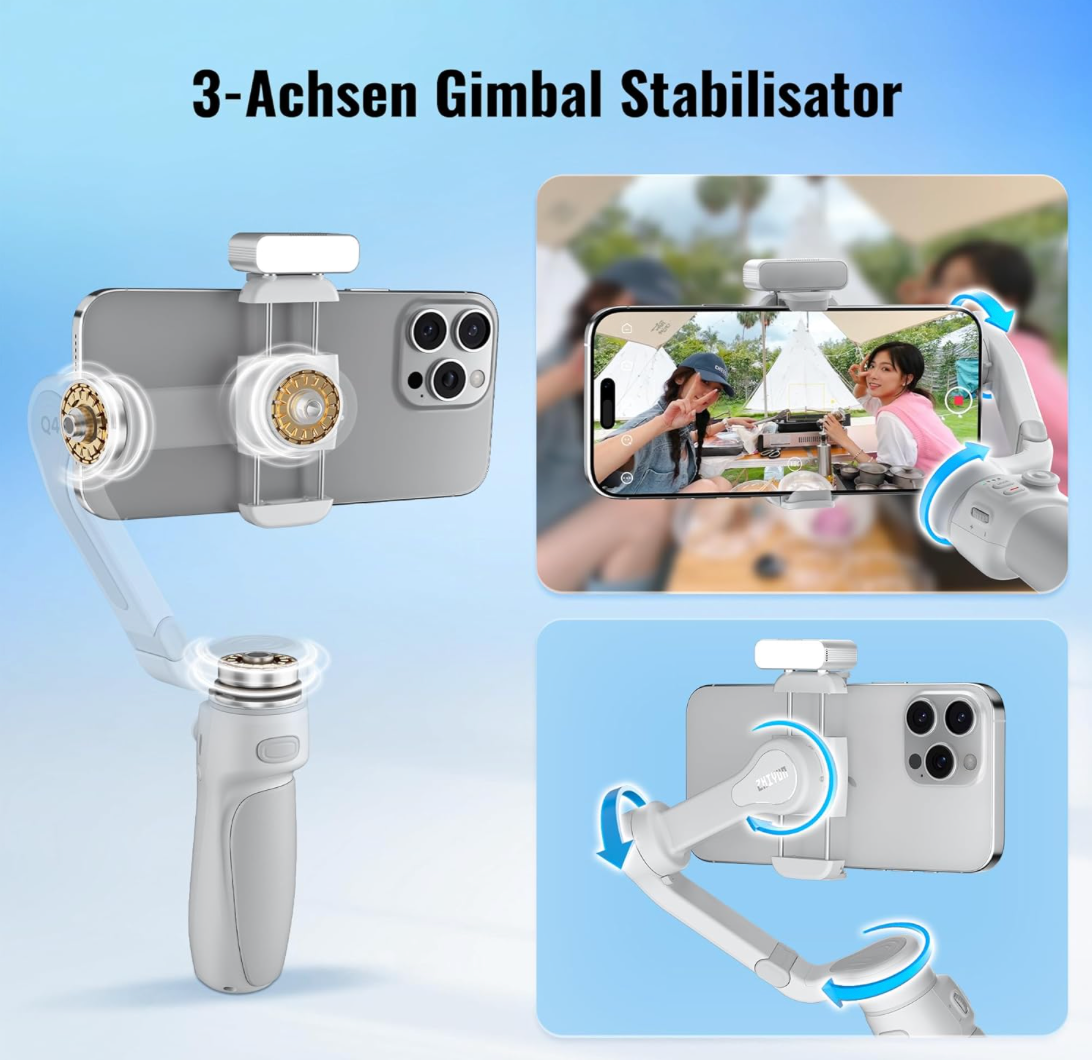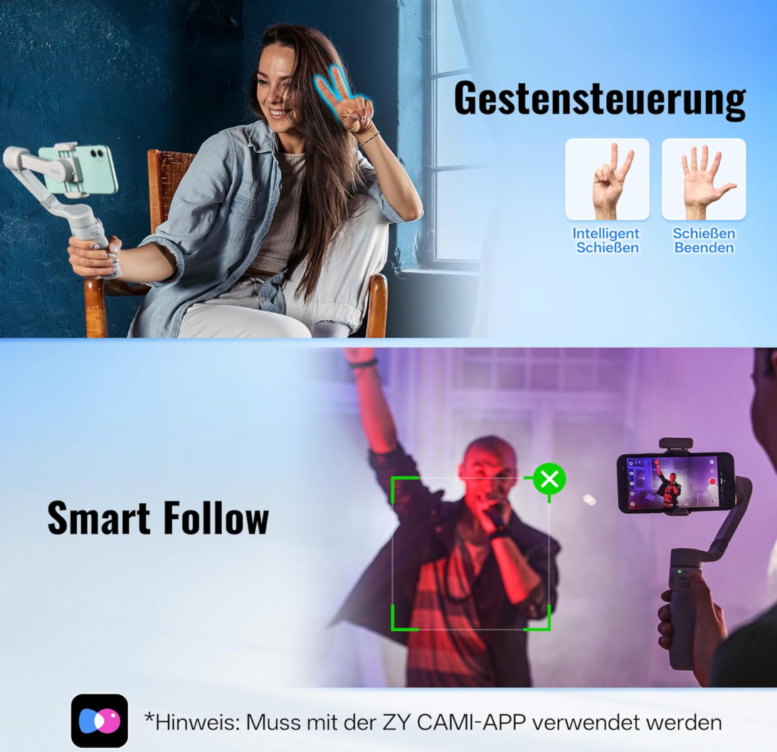 - [ Auf neue Weise faltbar ] Das ergonomische Design und die glatte Oberfläche des Smooth Q4 Smartphone Gimbal sorgen für ein großartiges Benutzererlebnis. Dank der besseren Griffigkeit und des einfachen Packdesigns können Sie diesen Smartphone Gimbal im Handumdrehen zusammen- oder auseinanderklappen und sind sofort für Ihre Aufnahmen bereit.